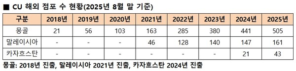 카자흐스탄은 2023년 6월 마스터 프랜차이즈 계약 체결 후 2024년 3월 알마티에 1호점인 CU 아스타나스퀘어점을 개점했고 현재 43개 점포를 운영 중이다. 2029년까지 500개 이상 확대 목표로 인접 국가로도 진출해 글로벌 K-편의점 입지를 강화할 계획이다.