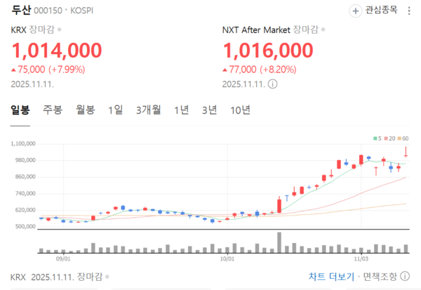 정규장 마감 이후 진행되는 NXT 사후시장(NextTrade After Market)에서도 상승 흐름은 지속됐다. 사후시장 기준 두산은 101만6000원(전일 대비 +8.20%)에 거래되며 정규장을 웃도는 시세를 형성했다.